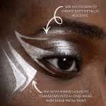Mehron Mixing Liquid と混ぜることで、水に強いリキッドタイプのメタリックカラーとして使用可能になります。